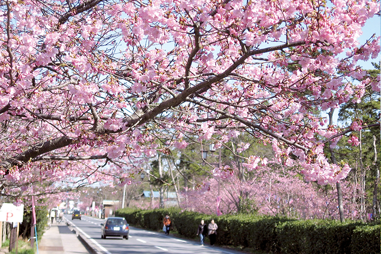 約500本の河津桜が直線道路沿いに咲く白子町の県道30号線(九十九里ビーチライン)。まっすぐ続く桜並木は2月中旬頃から開花が始まり、房総の春をいち早く感じることが出来ます。