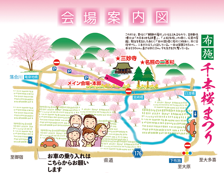 布施三妙寺下をメイン会場に、期間中の土・日曜日・祝日には出店者による模擬店の他、農産物等の販売が催されます。