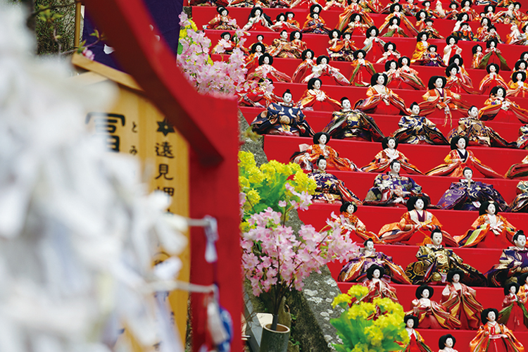 春の風物詩となっている、勝浦市の「かつうらビッグひな祭り」 昨年から勝浦市芸術文化交流センターKüste(キュステ)での大規模展示が復活され、さらに賑わいが期待されています。メイン会場の遠見岬神社をはじめ、周辺では覚翁寺山門前に約600体、墨名交差点には約1000体と、それぞれ特設雛段が設置され、その景色は圧巻です。
