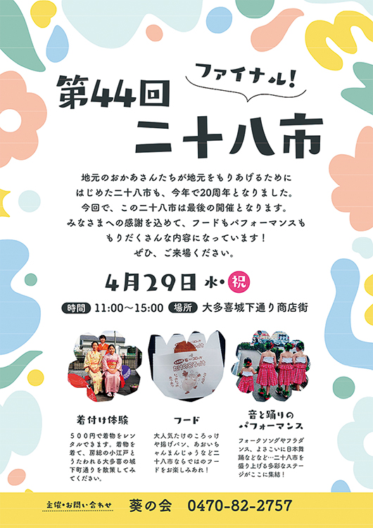 20年の長きにわたり続いた「二十八市」、今回で最後の開催となりました。『私たちにも町おこしの為に何かできることがあるんじゃないか?』と集まった地域のおかみさんたちでスタートした「葵の会」は、地域のイベントや町の行事に参加したり、商店街で二十八市の開催など活動されていました。